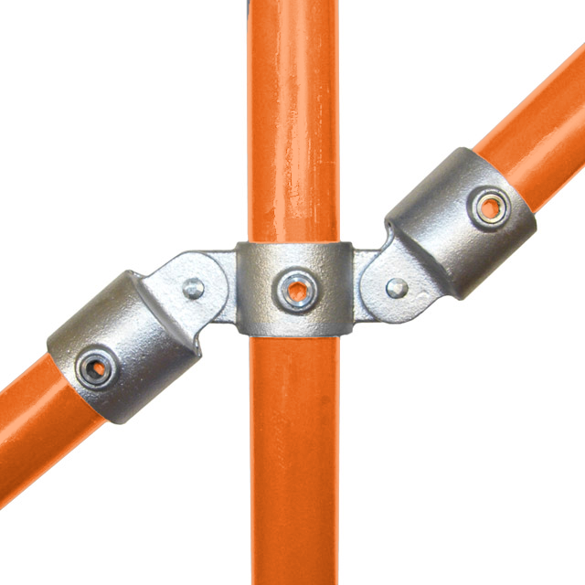 The 167 Double Swivel Connection is a versatile swivel fitting, useful for awkward applications where angles cannot be accommodated by adjustable angle fittings. The assembly is riveted together, although items can be supplied separately as 167M and 2 x 173F. The through tube (vertical in the photo) cannot be joined within the fitting. Warning: To provide sufficient stability, whole structures must not be made from swivel fittings alone.